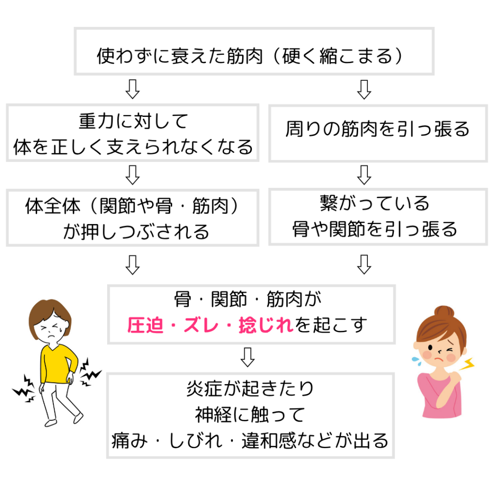 なので「体を支える筋肉」が機能失調してくると、垂直にかかる重力に対して体を正しく支えられなくなり、関節や骨、筋肉が上から押しつぶされて、圧迫・捻じれ・ズレが起こります。