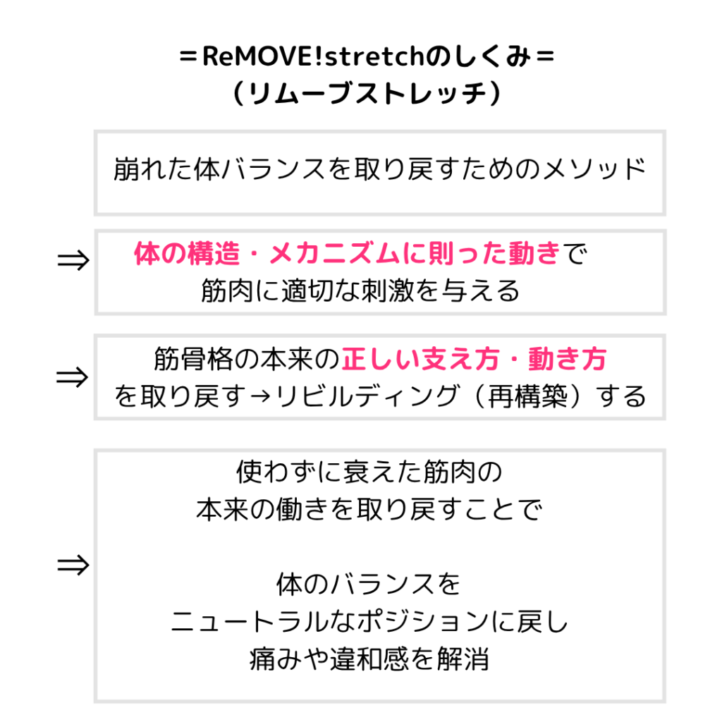 それができるのが、自分で自分の体を整える習慣を身に着ける運動メソッドでもあり、この先一生使えるのカラダのお手入れ方法とも言える、ReMOVE!strech(リムーブストレッチ)です。